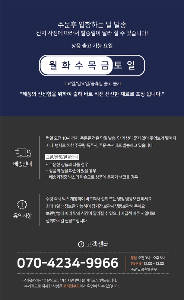 | 8. 보관방법 또는 취급방법 | 받으시면 반드시 냉장 또는 냉동보관 |